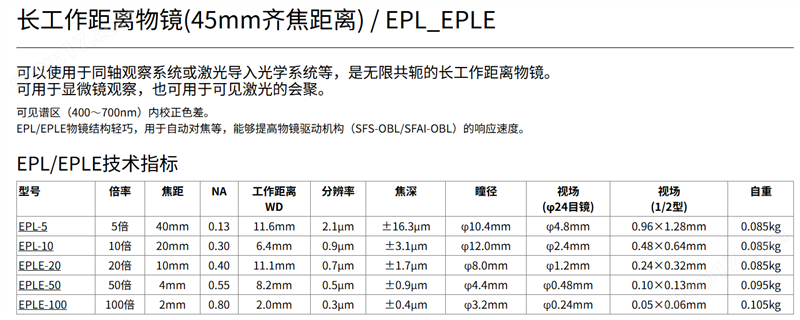 ◦EPL/EPLE物镜结构轻巧,用于自动对焦等,能够提高物镜驱动机构(SFS-OBL/SFAI-OBL)的响应速度。